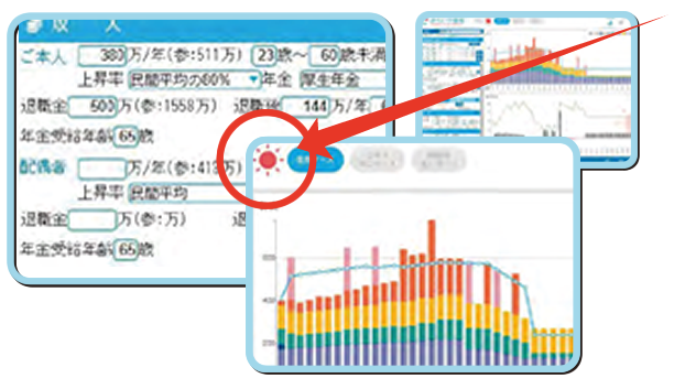 みらい予想図はライフプランニングを図るための簡易ソフトで、タブレット端末やパソコンに対応しています。顧客と対面しながら使えるように、3分から5分程度の入力操作で世帯の収入や支出などをもとにした家計の状況や、保険の必要保障額などが診断できる点を最大の特徴としています。